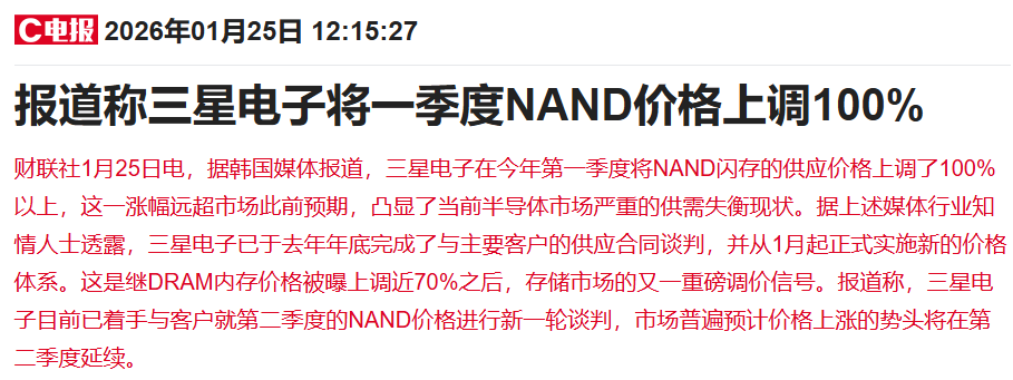 据报道,三星电子在今年第一季度将NAND闪存的供应价格上调了100%以上,这一涨幅远超市场此前预期,凸显了当前半导体市场严重的供需失衡现状。