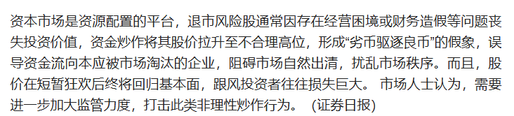 证券日报发文表示需要进一步加大监管力度,打击此类非理性炒作行为。资本市场是资源配置的平台,退市风险股通常因存在经营困境或财务造假等问题丧失投资价值,资金炒作将其股价拉升至不合理高位,形成“劣币驱逐良币”的假象,误导资金流向本应被市场淘汰的企业,阻碍市场自然出清,扰乱市场秩序。而且,股价在短暂狂欢后终将回归基本面,跟风投资者往往损失巨大。 市场人士认为,需要进一步加大监管力度,打击此类非理性炒作行为。